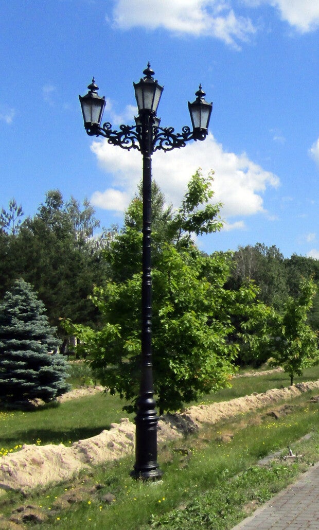 Produktbeschreibung: Gusseisen-Außenlaterne mit 2 Laternenköpfen H 400 cm