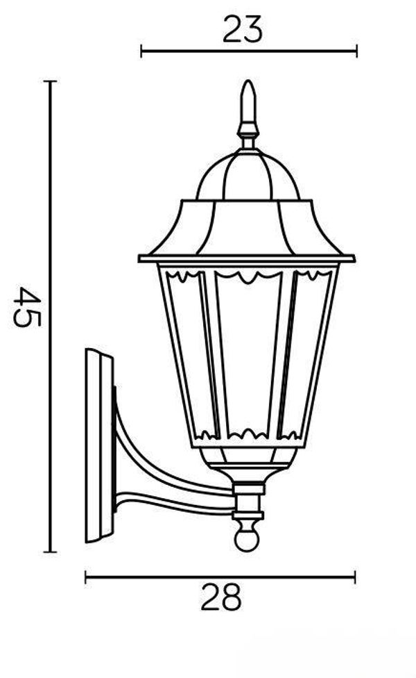 Dieser elegante Außenkinkiet im klassischen Laternenstil zeichnet sich durch klare Linien, ein nach oben gerichtetes Arm und ein zeitloses Design aus. Das Gehäuse besteht aus pulverbeschichtetem Aluminium in Schwarz, kombiniert mit sandgestrahlten Glasflächen, die für eine angenehme, weiche Lichtstreuung sorgen und der Leuchte eine stilvolle und zugleich robuste Optik verleihen.