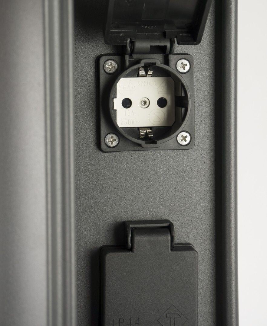 Diese moderne Außen-Stehleuchte verbindet zuverlässige Beleuchtung mit hoher Funktionalität. Sie ist mit zwei integrierten 230-V-Steckdosen ausgestattet, die eine maximale Anschlussleistung von 2 × 1500 W ermöglichen und sich ideal zum Betrieb verschiedener Gartengeräte oder Elektrogeräte im Außenbereich eignen.