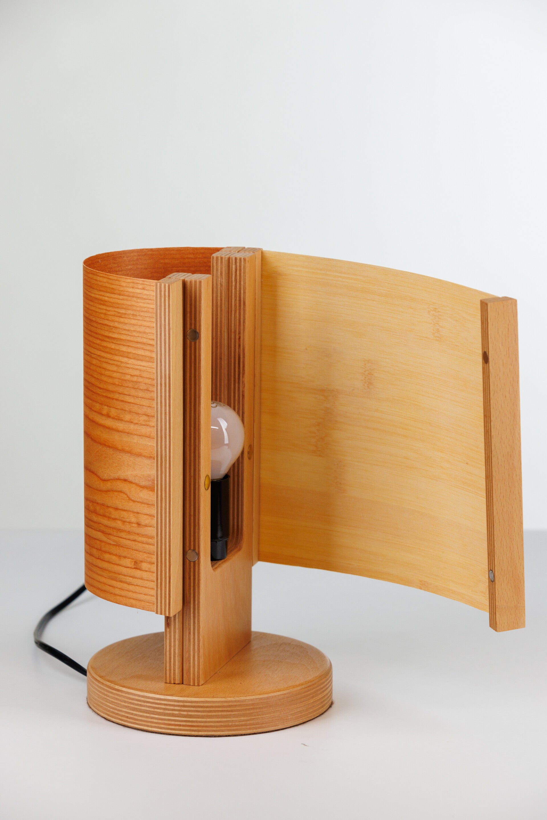 Diese kompakte Tischleuchte ist die verkleinerte Ausführung des großen Modells und eignet sich ideal für Sideboards, Nachttische oder kleine Ablageflächen. Die stabile Basis aus Buchenholz wird durch zwei magnetisch befestigte Holzpaneele ergänzt. Mit insgesamt zehn verfügbaren Paneelen lassen sich zahlreiche Kombinationen gestalten – zwei identische oder zwei unterschiedliche Elemente ermöglichen immer neue, überraschende Lichteffekte.